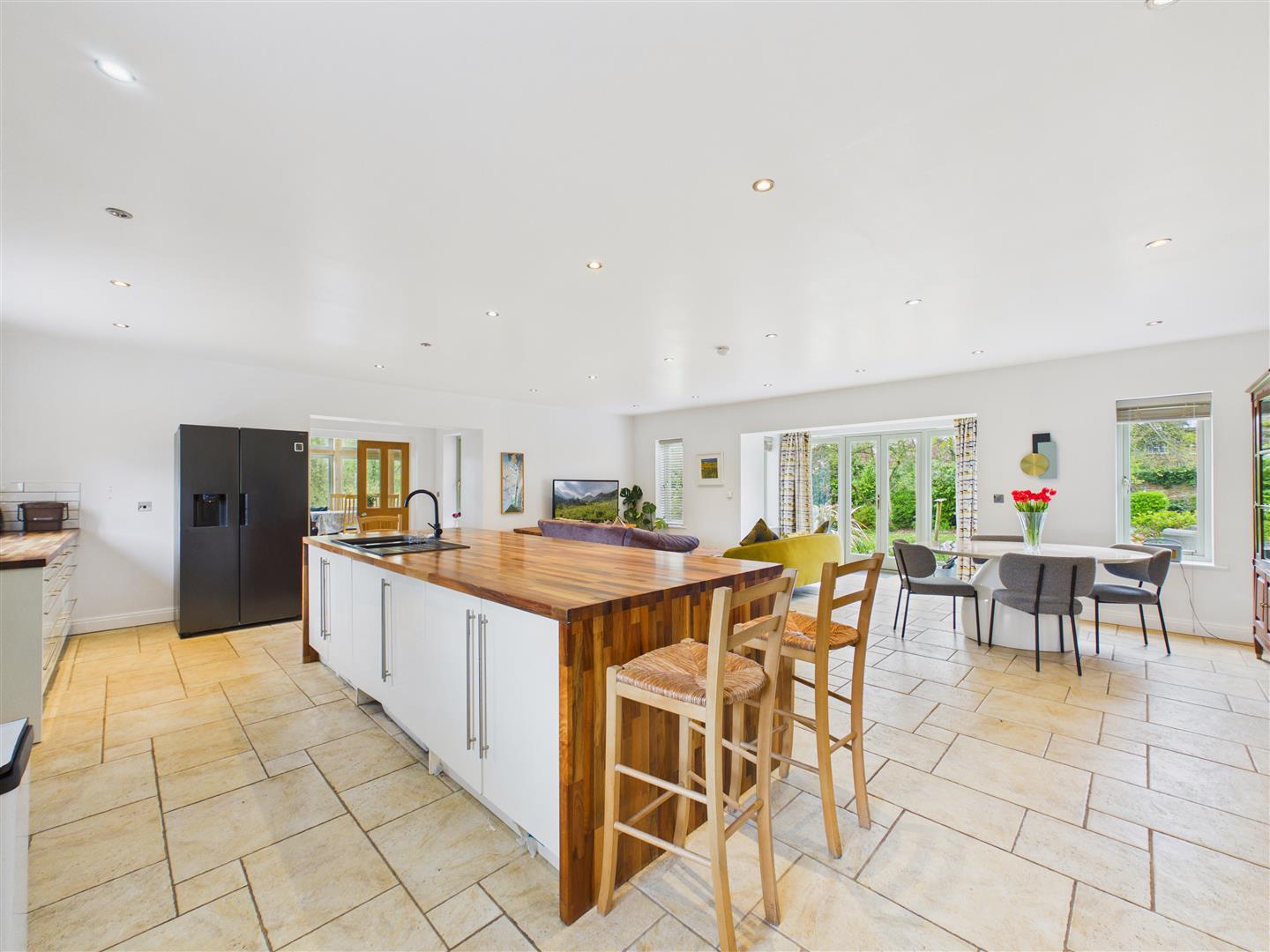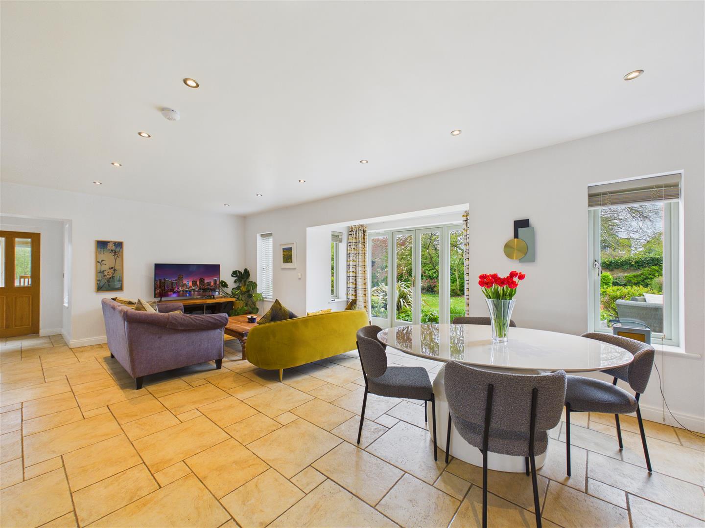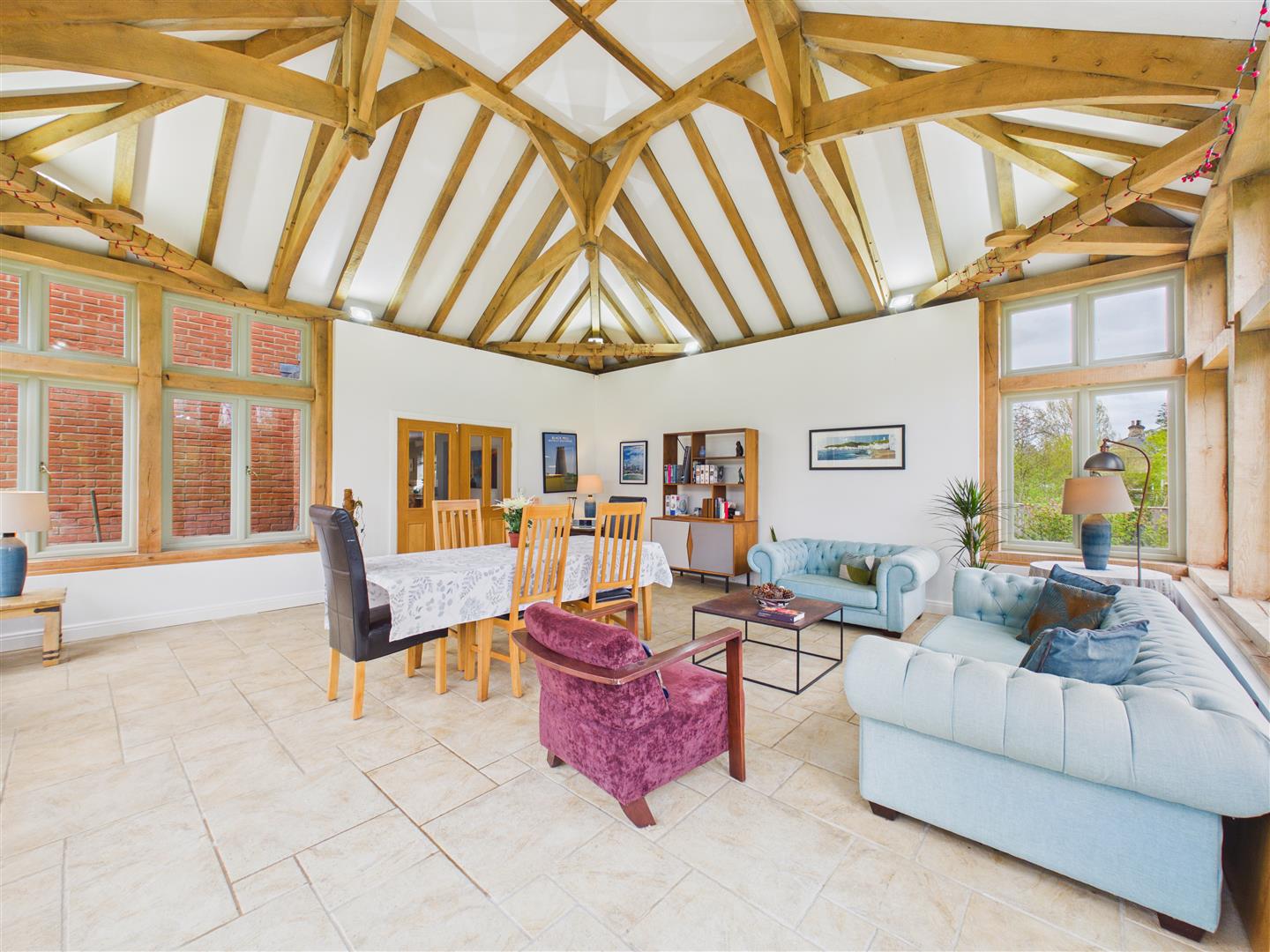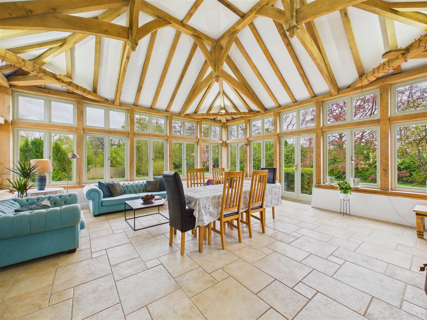 This outstanding green oak orangery is a standout feature, meticulously crafted with a solid oak frame and striking exposed trusses. Designed to take full advantage of the property’s unique woodland backdrop, the room features expansive glazing to three sides and high-quality travertine tiled flooring. It serves as a light-filled extension of the main living area, with double French doors providing direct access to the garden and terrace.