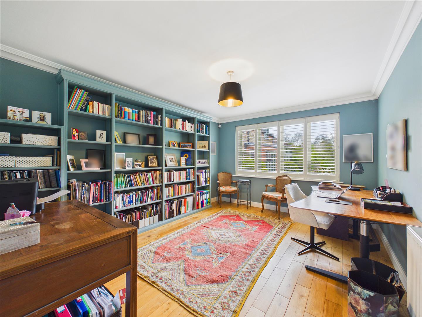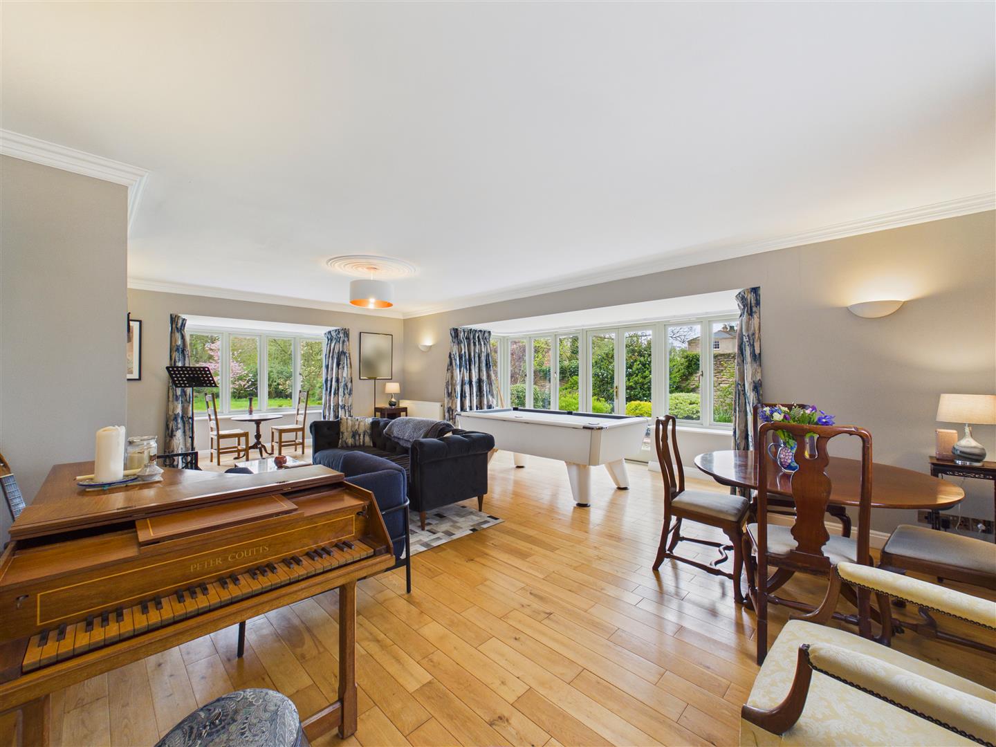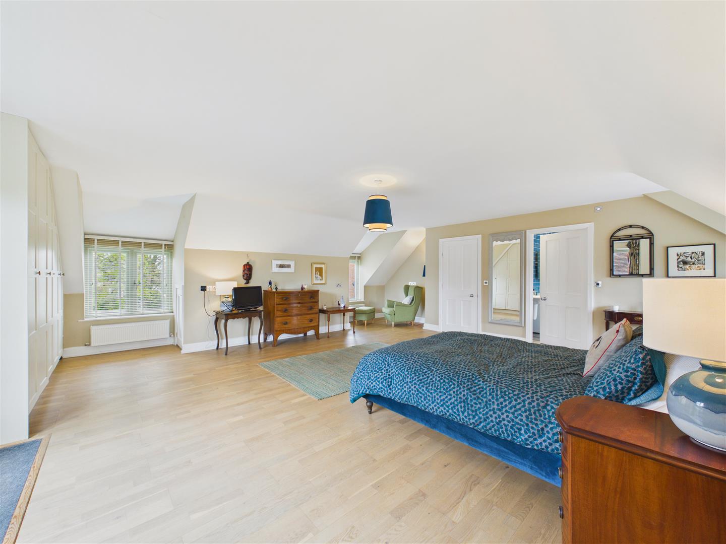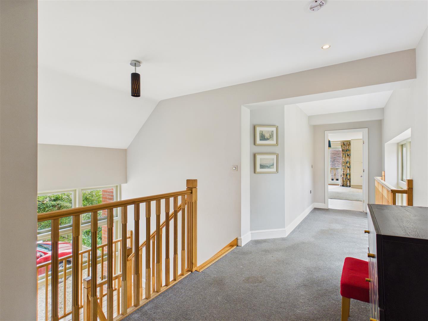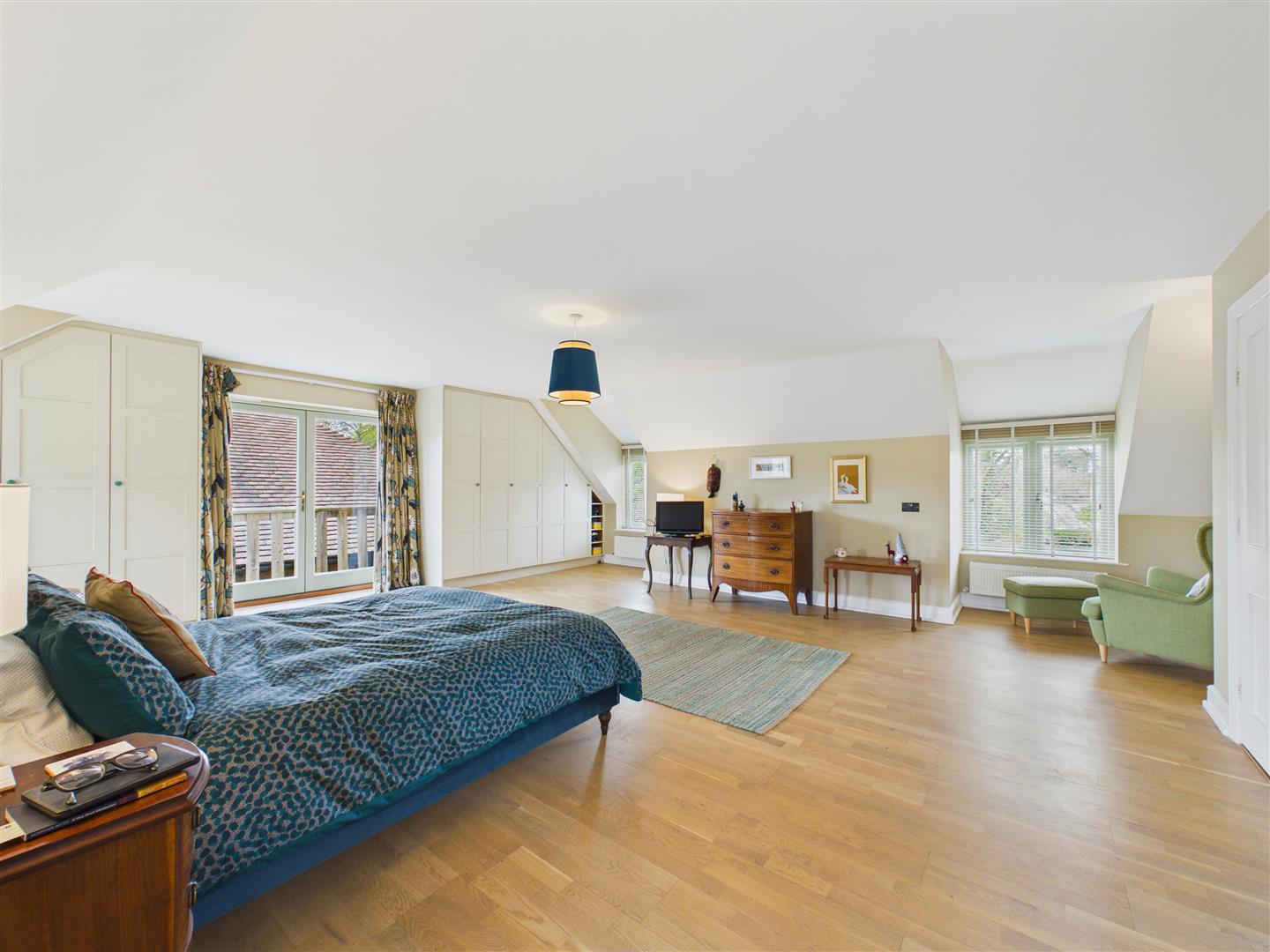 The first floor is equally grand, accommodating five bedrooms and four bathrooms, including a primary suite set within its own private wing. Outdoor living is celebrated on the elevated, south-west facing terrace, which extends across the rear of the house. There is also a walled garden area to the side. From here, steps lead down to substantial lawns and a wooded area at the foot of the garden. Approached via secure electric gates, with an integral double garage and extensive parking, this property is a rare "lifestyle" opportunity of truly unique character and grand design.