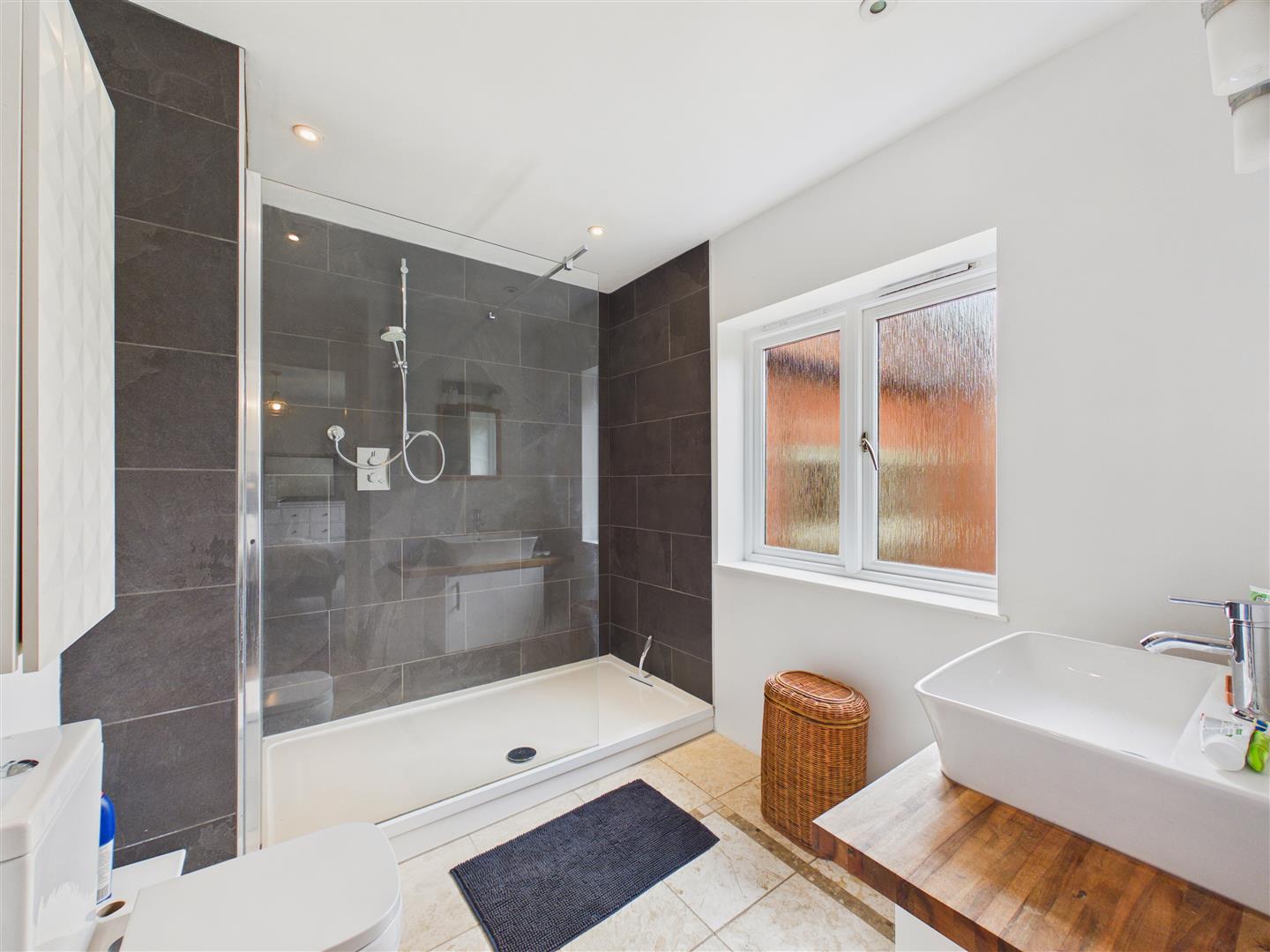 With stylish suite comprising a walk in shower, vanity unit with solid walnut top and wash hand basin, low flush W.C., heated towel rail, tiled floor, inset spot lights and window to rear.