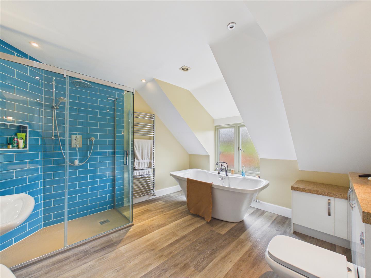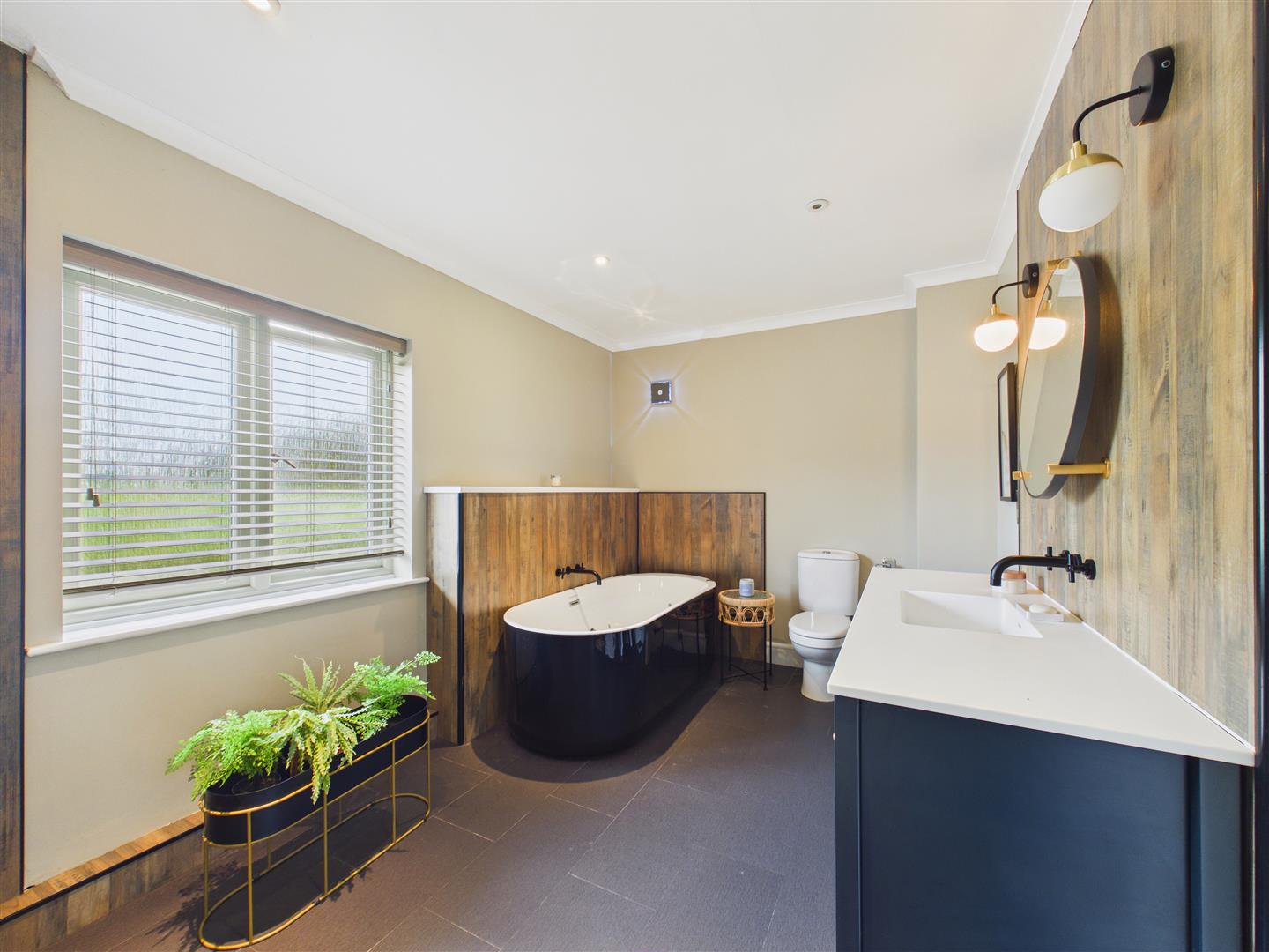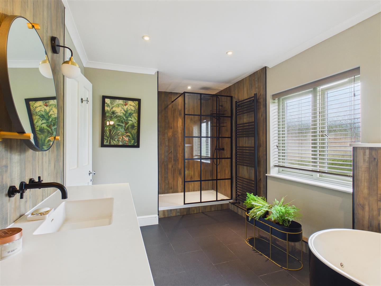 With luxurious suite comprising a freestanding bath, walk in shower, twin wash hand basins and fitted cabinets with low flush W.C.