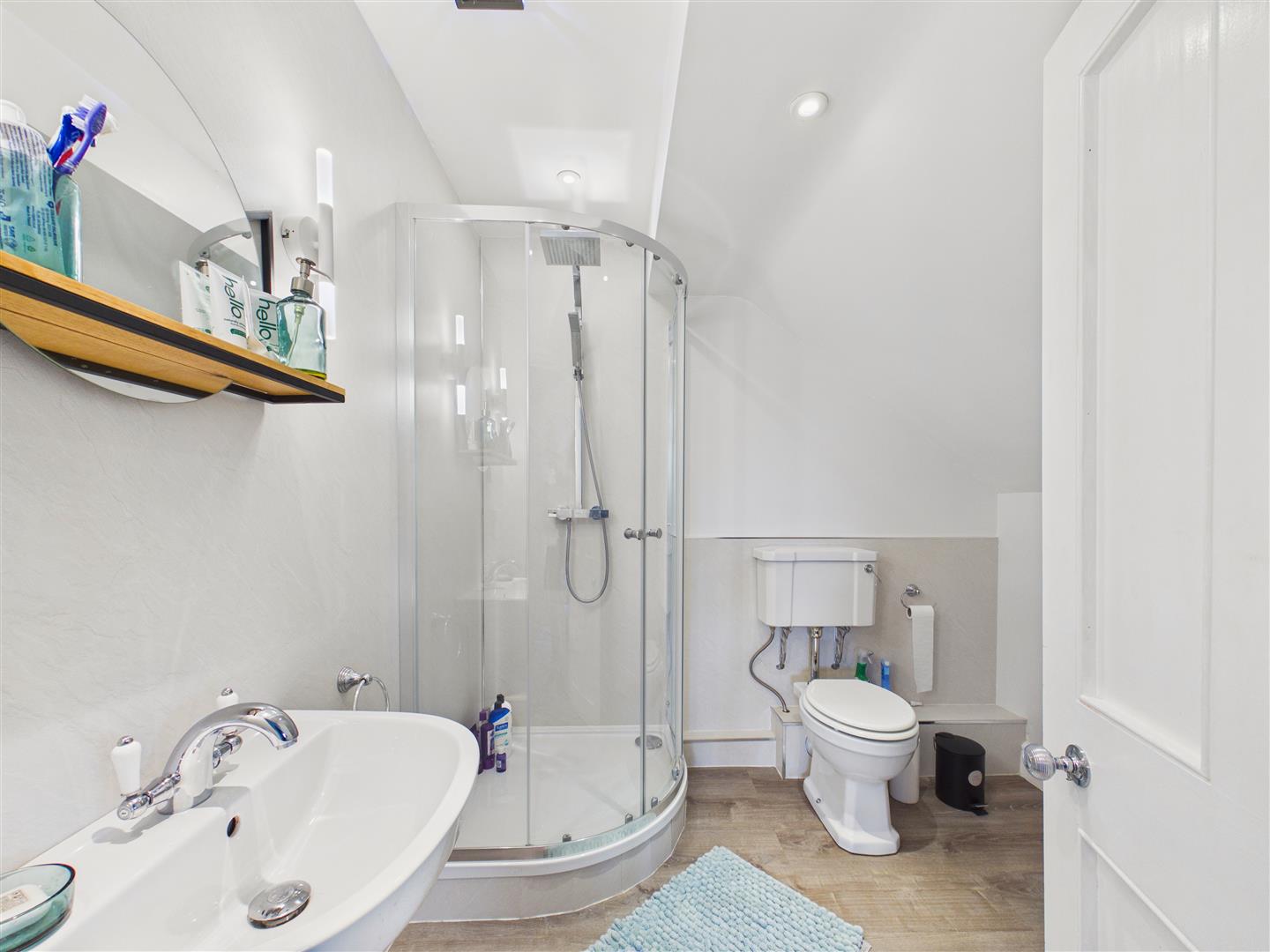 With suite comprising a shower enclosure, wash hand basin and low flush W.C. Heated towel rail and inset spot lights.