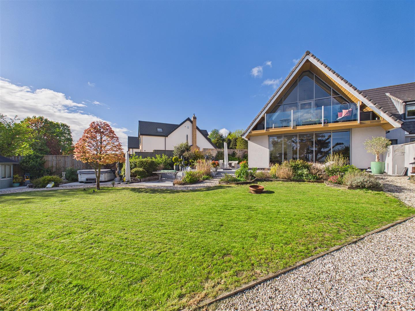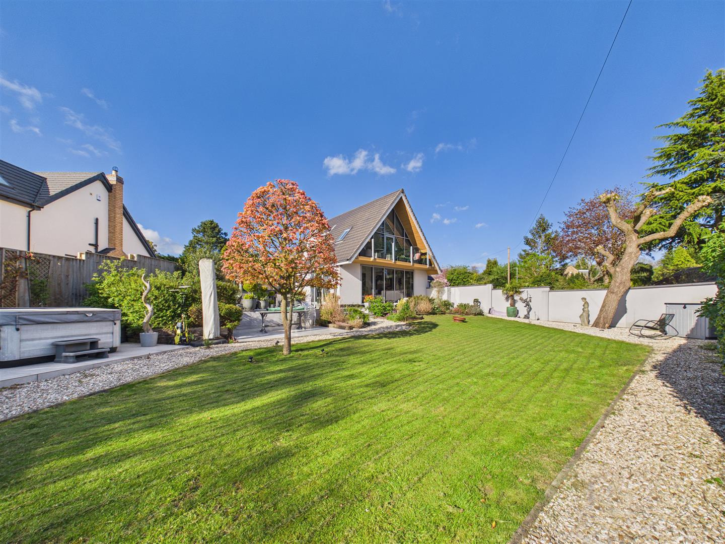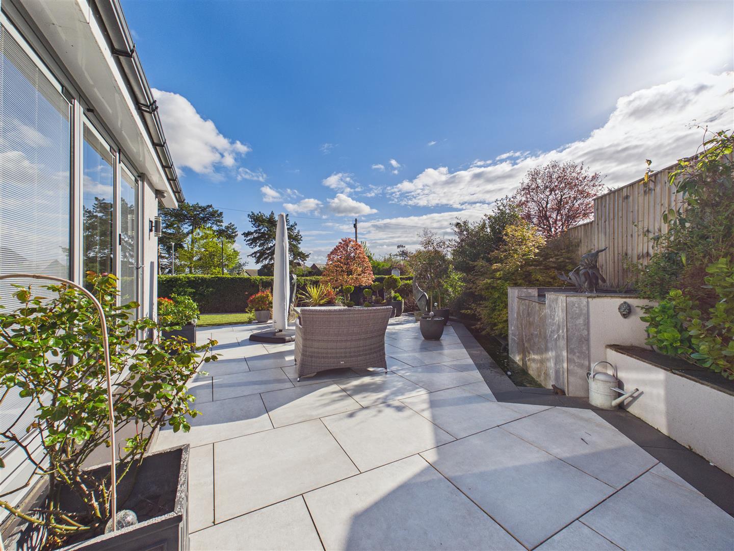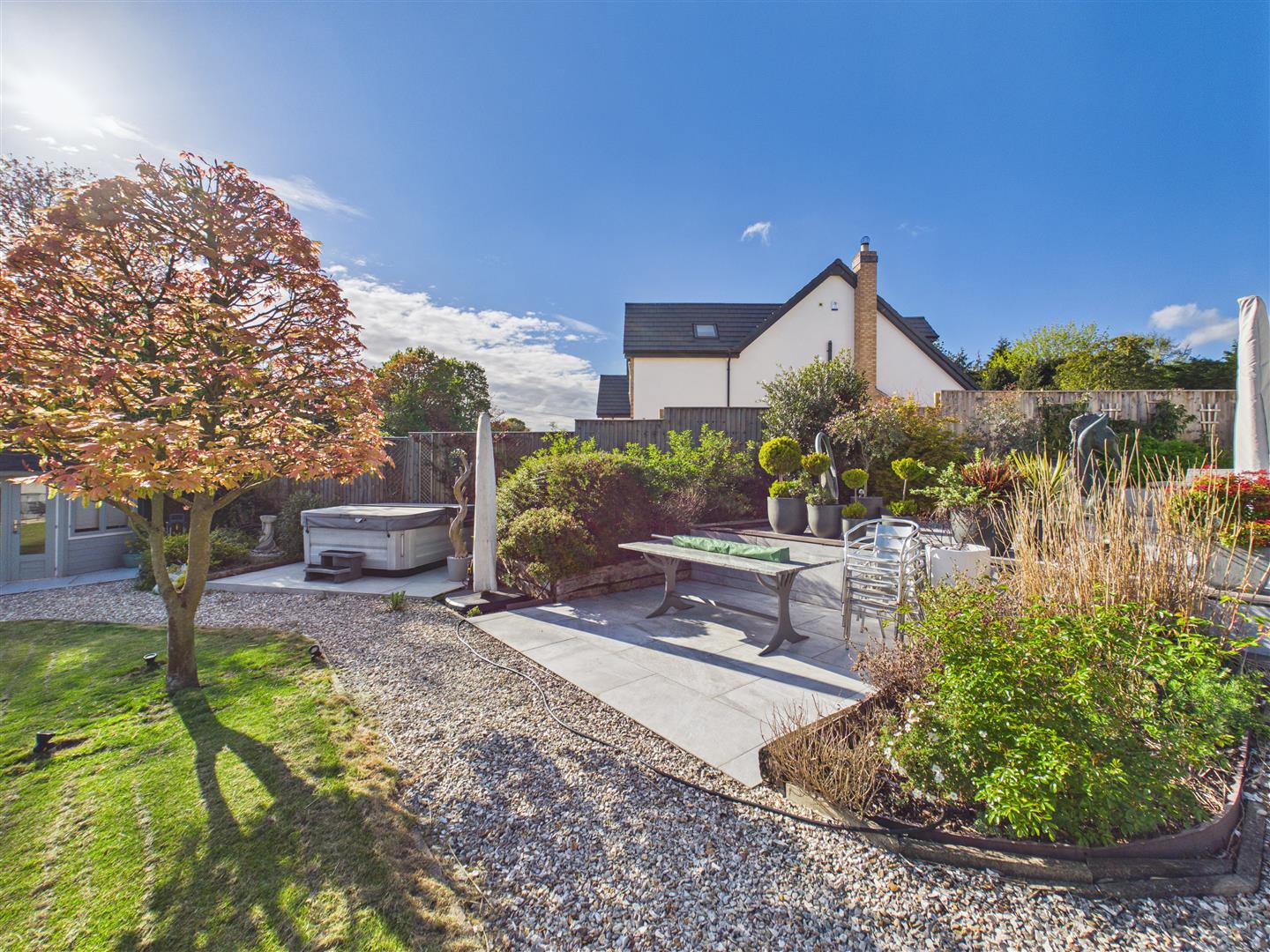 Occupying a superb plot of approximately 0.23 acres, the property is approached via a high-quality resin driveway leading to the garage with an automated door. The rear garden enjoys a favoured southerly aspect, featuring a spacious patio area that transitions seamlessly from the internal living spaces. This entertaining area is bordered by a bespoke filtered stream and cascading waterfall, creating a tranquil backdrop for alfresco dining. Beyond the water feature, steps descend to a landscaped lawn, with the entire outdoor space further enhanced by a smart automated irrigation system and comprehensive smart exterior lighting.