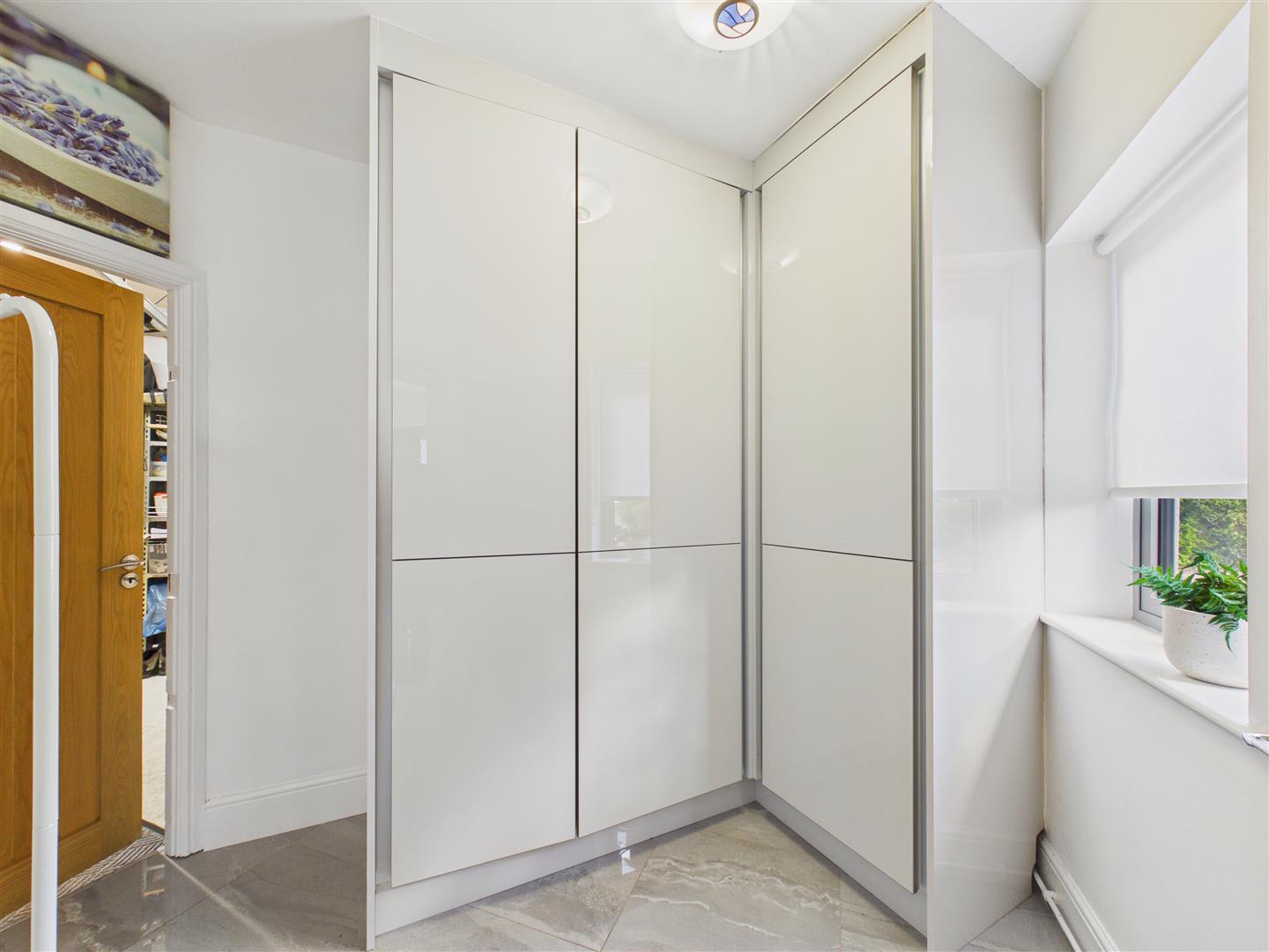 With fitted storage and plumbing for a washing machine plus space for dryer. Window to the front elevation and tiled floor. Internal access door to garage.
