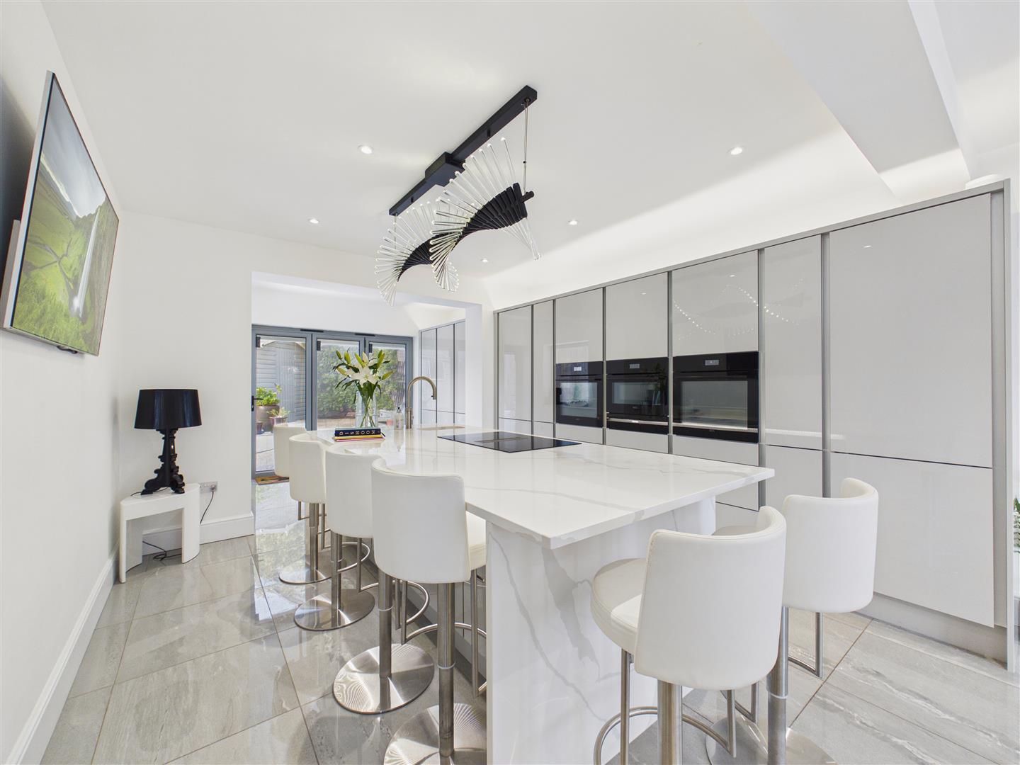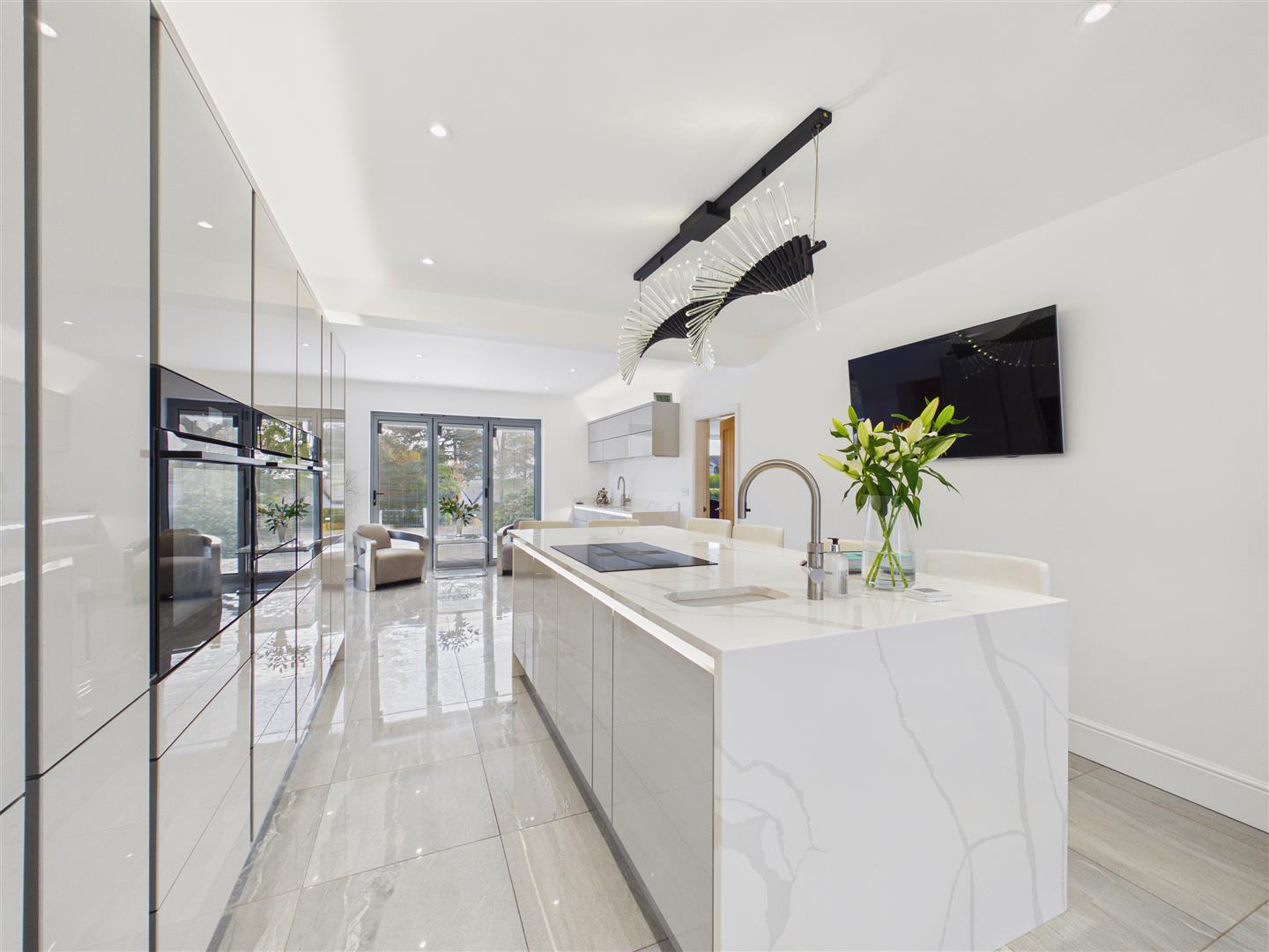 The heart of the home is the expansive lounge, featuring floor-to-ceiling glazing and bi-folding doors with automated blinds that open fully to the rear garden. The kitchen is a chef’s dream, equipped with high-gloss units and a granite-topped central island featuring a prep sink and Quooker tap. A full suite of premium appliances includes two AEG smart ovens, a Miele induction hob, and a second Quooker boiling water tap. Beyond the kitchen lies a practical utility room and a dining room, while a ground floor bedroom (currently used as a home office) offers bi-folding doors to the garden and access to a modern shower room.