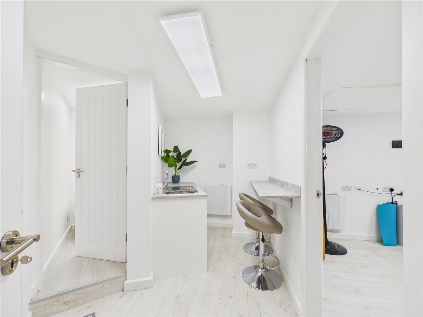 With fitted uits incorporating a sink and drainer. There is an electric heater and external access door to rear.