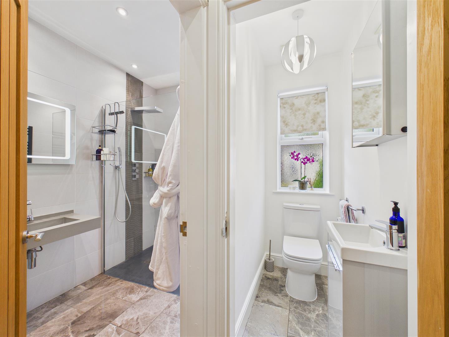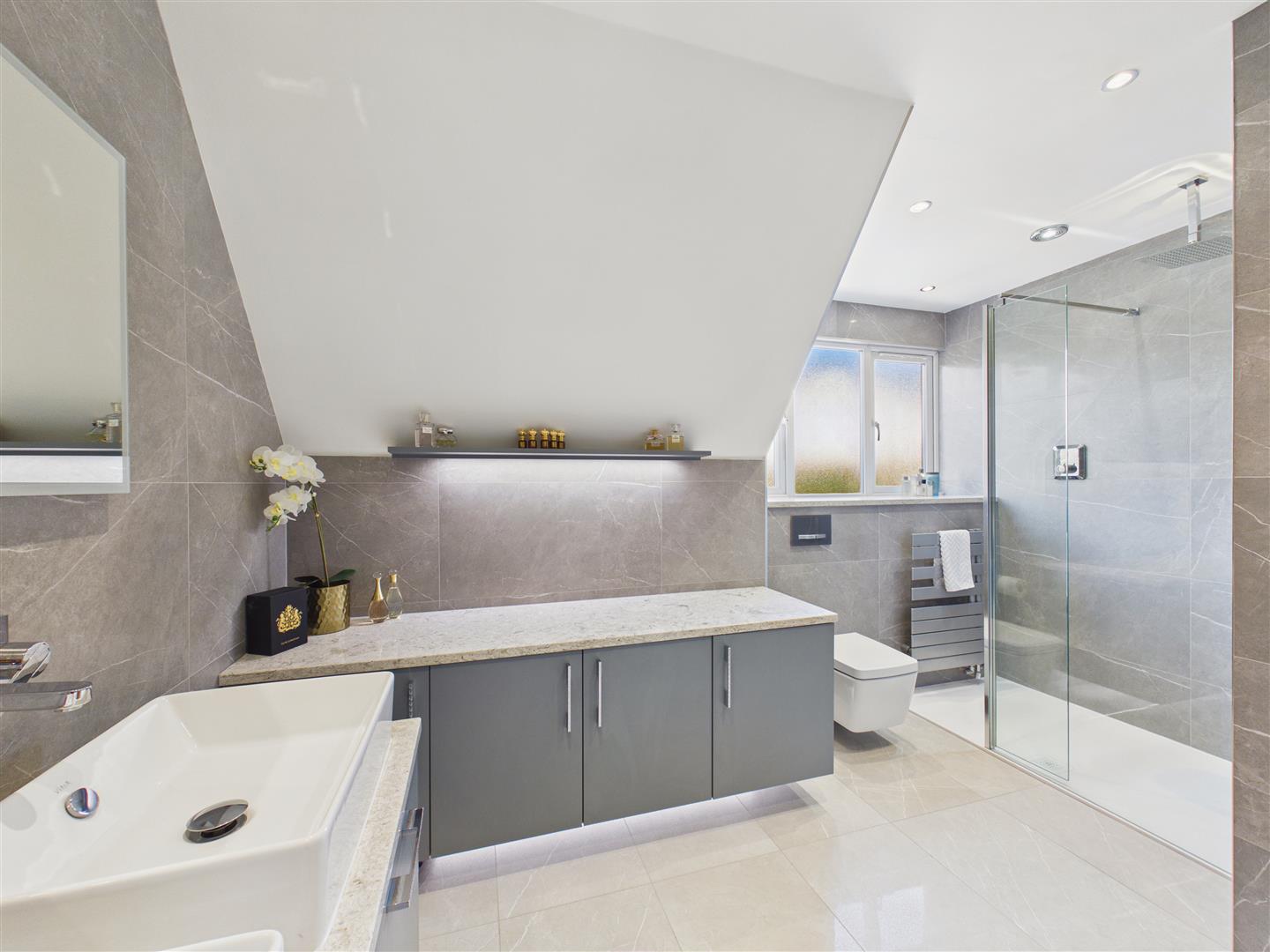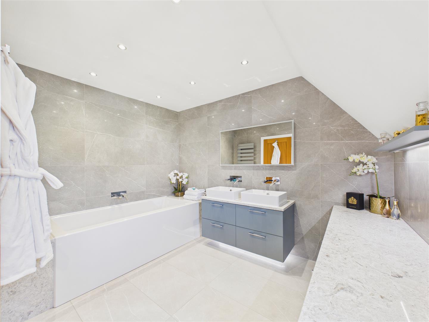 This luxurious suite comprises a bath, walk in shower, low flush W.C., vanity unit with quartz tops and twin sinks plus fitted cabinets with quartz tops. Tiling to walls and floor, heated towel rail and window to rear.