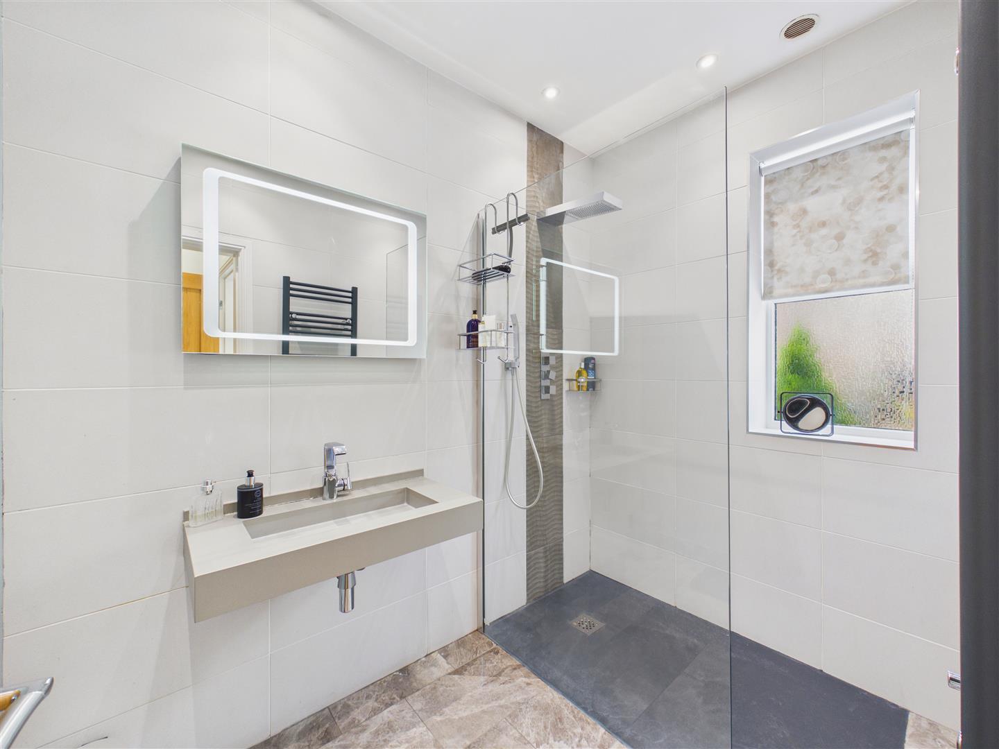 With contemporary suite comprising a walk in shower with rainhead and handheld shower, feature basin with lit mirror above, tiled floor and part tiling to walls, inset spot lights and window to side.