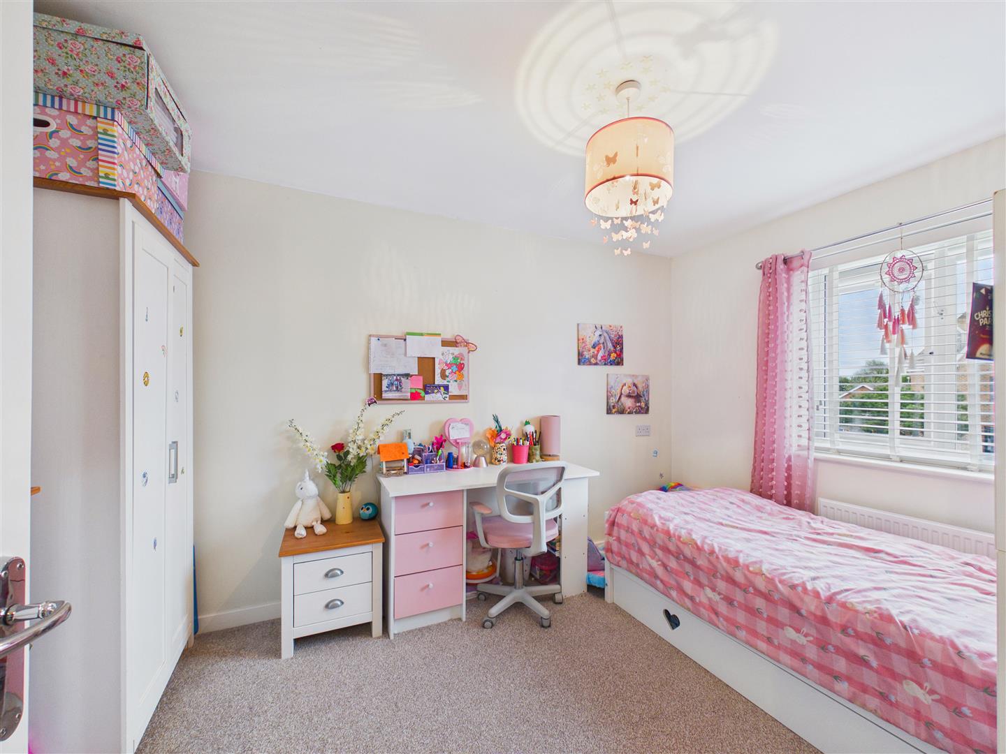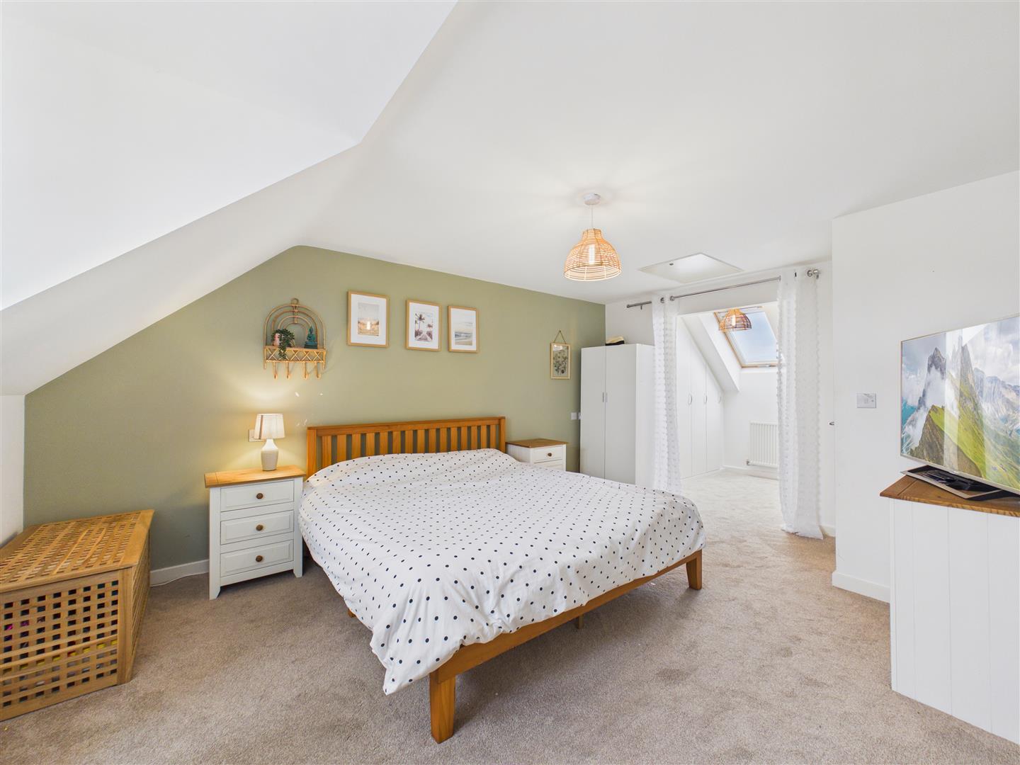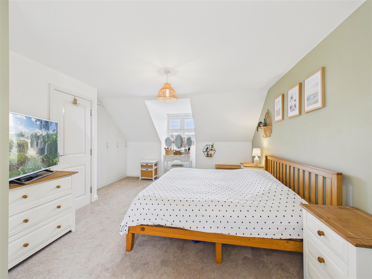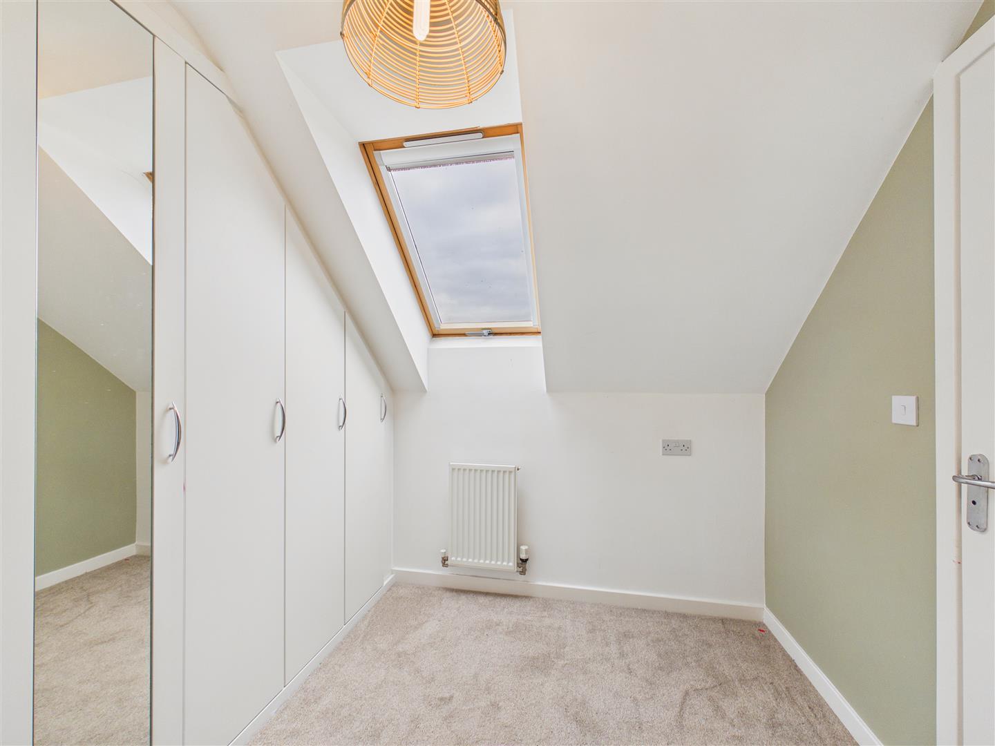 With fitted wardrobes and large storage cupboard. Window to the front elevation.