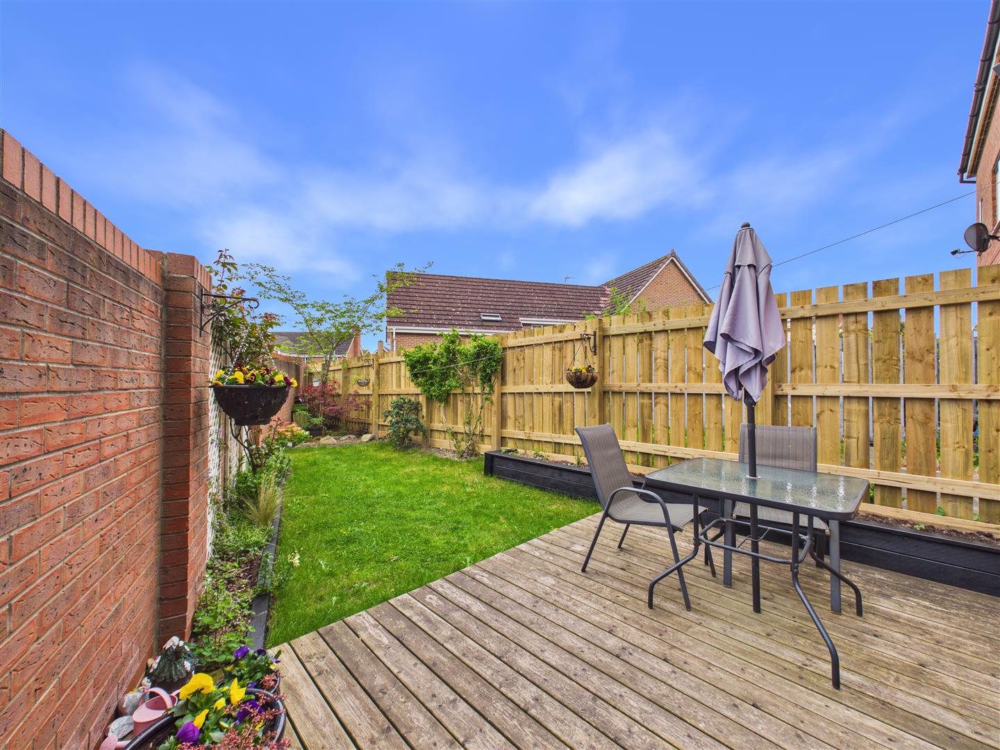 Externally, the property features an attractive front garden and a well-tended rear garden with a decked patio, lawn, and side pedestrian access. A garage with parking in front is situated within a separate block.