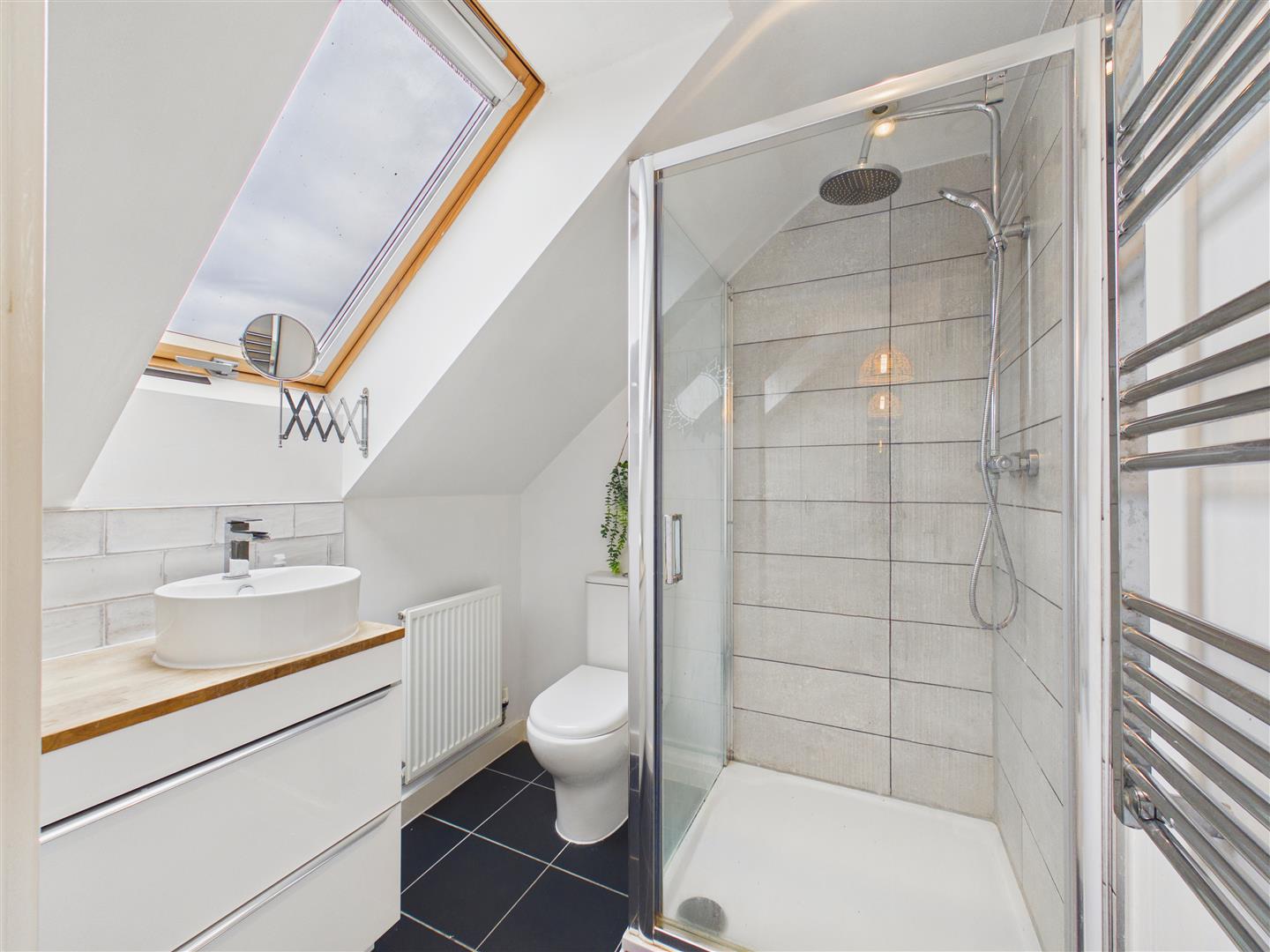 With suite comprising a shower enclosure, vanity unit with wash hand basin and low flush W.C. Window to rear.
