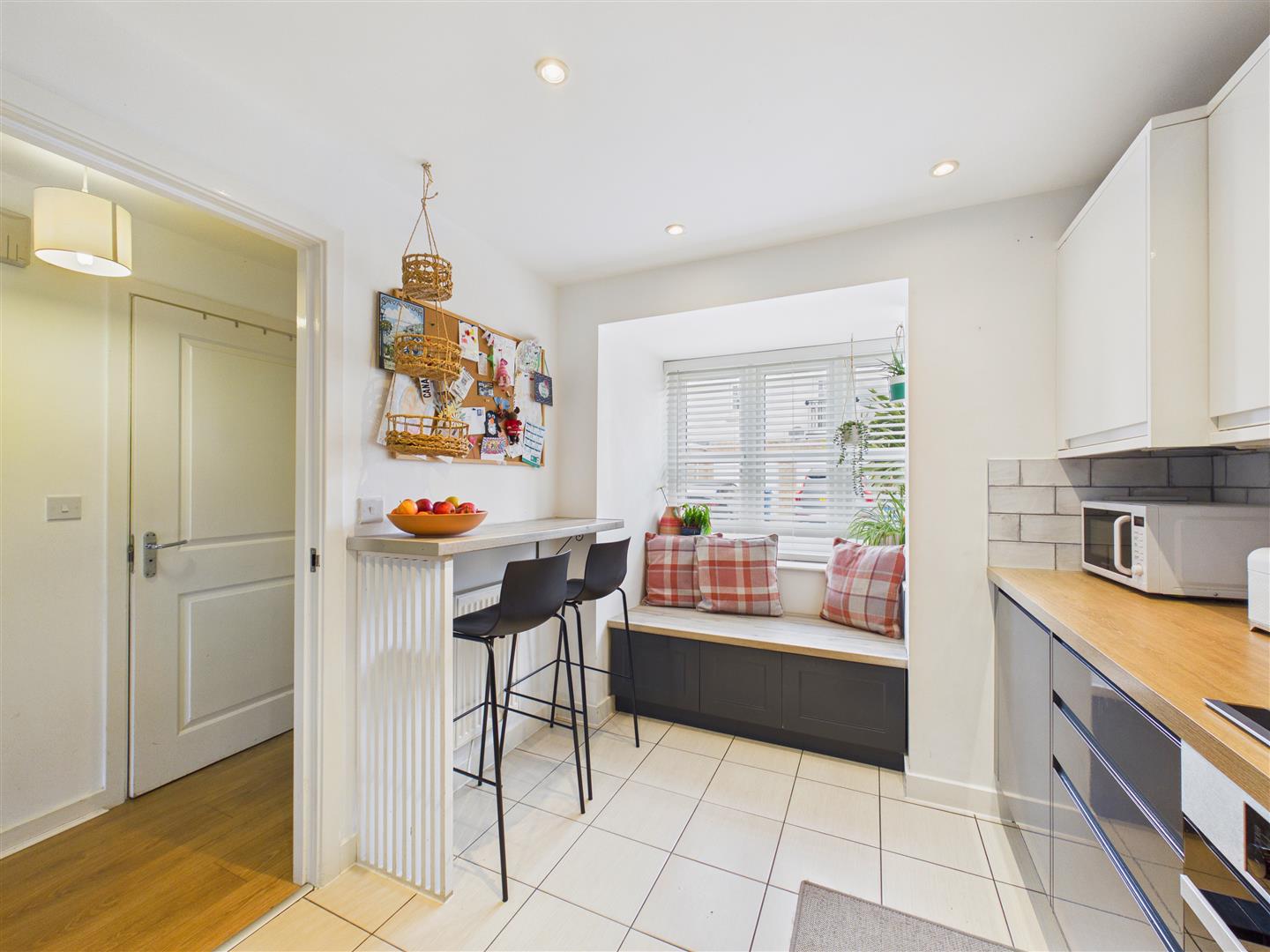 Having a range of stylish base and wall units with complementing worktops incorporating a sink and drainer with shower style mixer tap, oven and four ring gas hob with filter above plus a dishwasher. There is space for a fridge/freezer. There is a breakfast bar and a window seat built into the bay with storage.