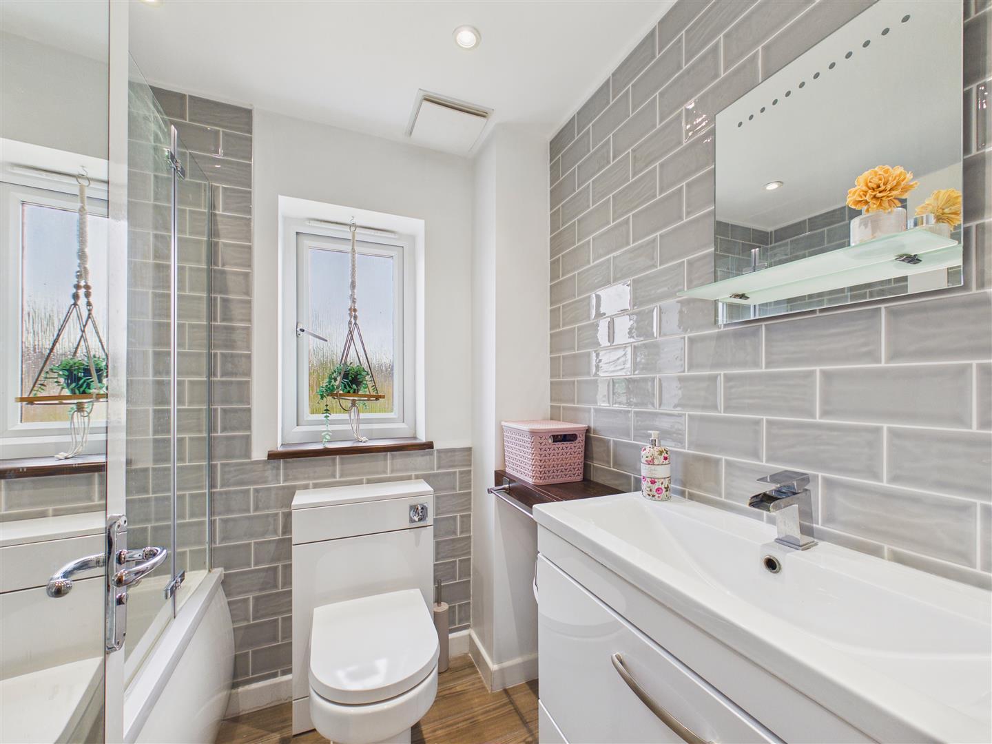 With modern suite comprising a bath with shower over and screen, large vanity unit with wash hand basin and low flush W.C. Window to rear.