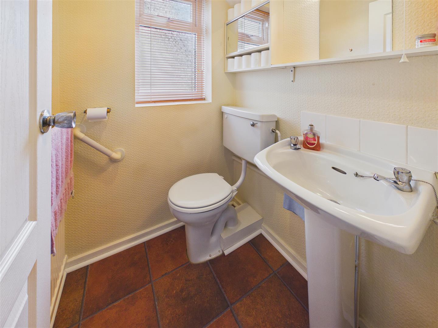 Wash-hand basin, low-flush W.C. and window to the side.