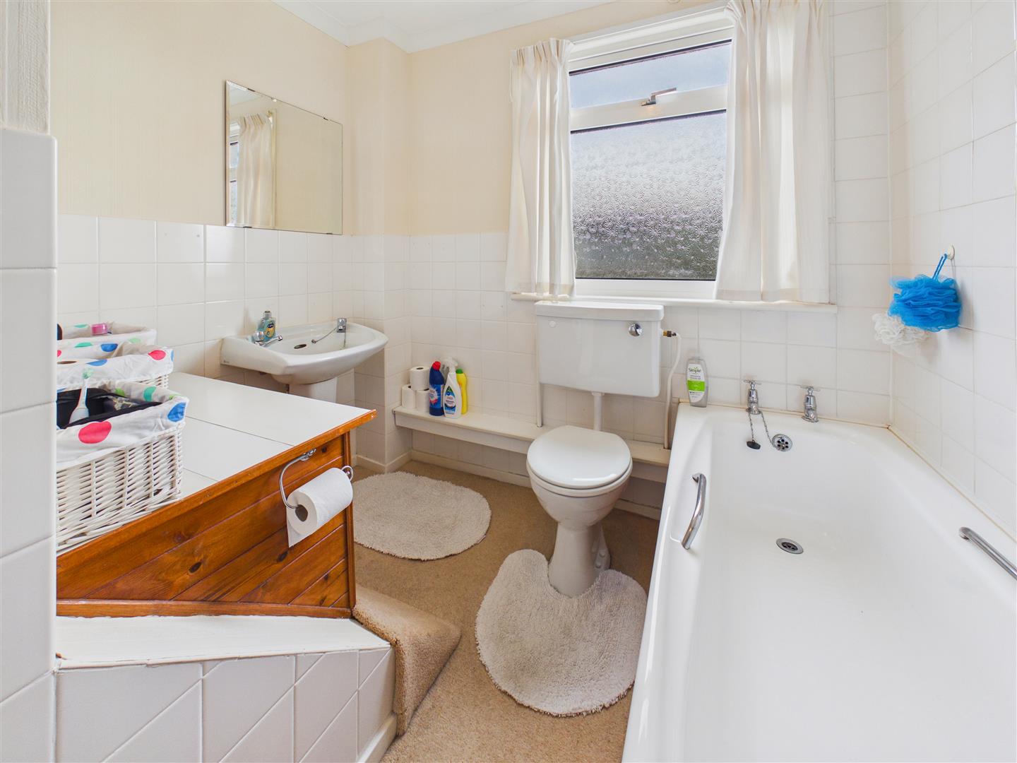 Comprising bath and shower unit with tiled surround, wash-hand basin and low-flush W.C. beneath window to the front elevation.