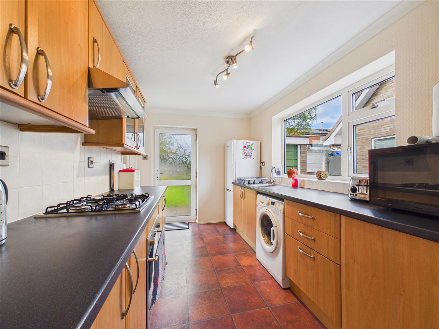 Comprising fitted units and worksurfaces, four-ring gas hob with filter unit above, integrated oven, sink & drainer beneath window to the side and plumbing for a washing machine. A door opens out to the rear garden.