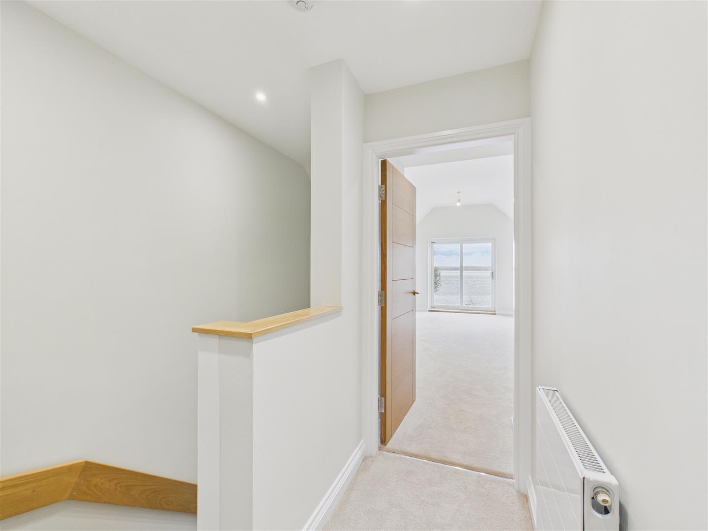 The second floor hosts two additional bedrooms, both with en-suite facilities. The principal bedroom is particularly striking, with a part-vaulted ceiling and double doors opening onto a Juliet balcony overlooking the estuary.
