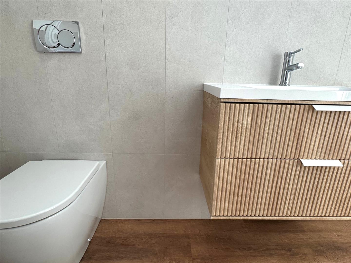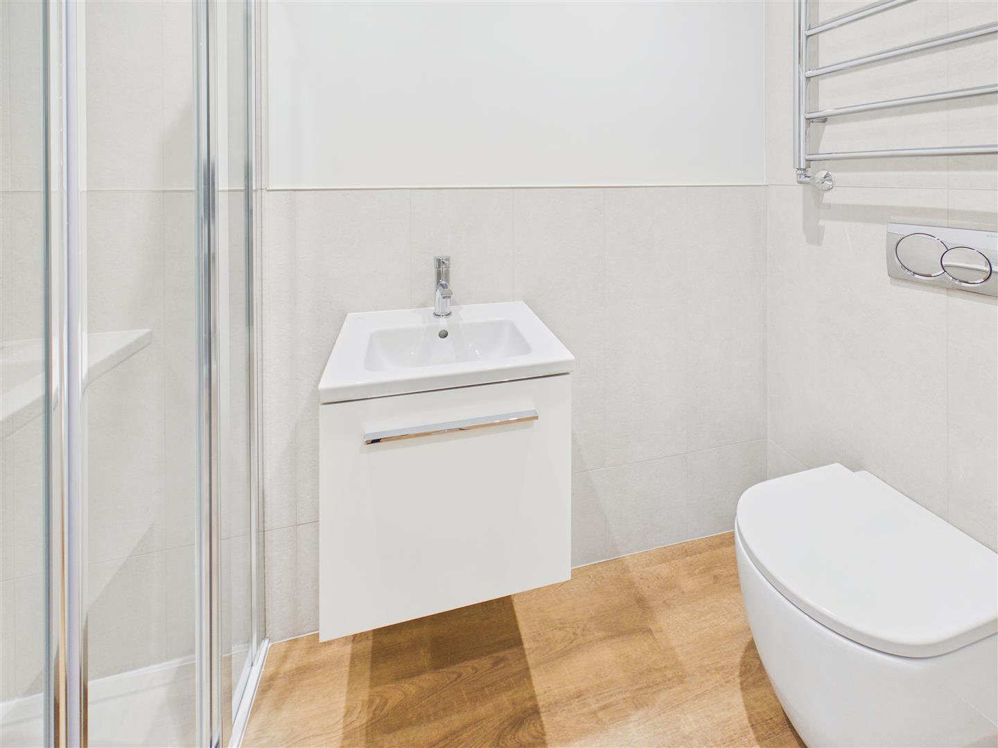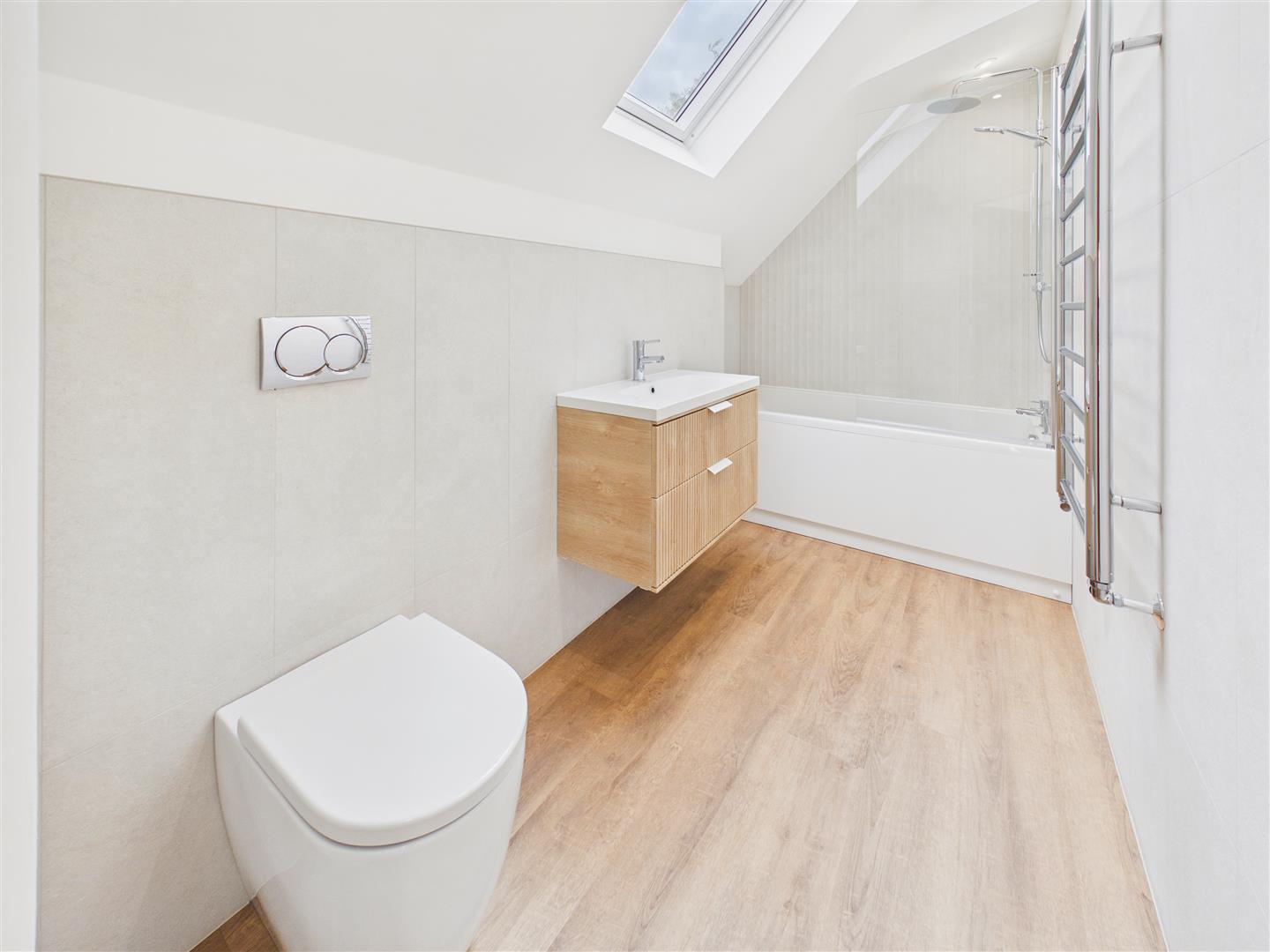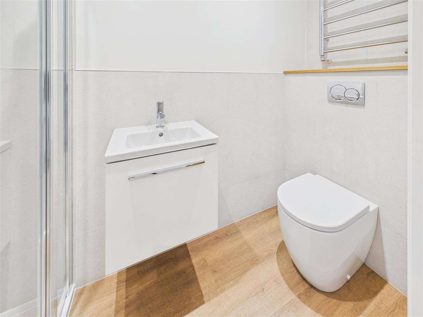 With concealed flush W.C., wash hand basin with cabinet, shower cubicle, tiled surround, heated towel rail.
