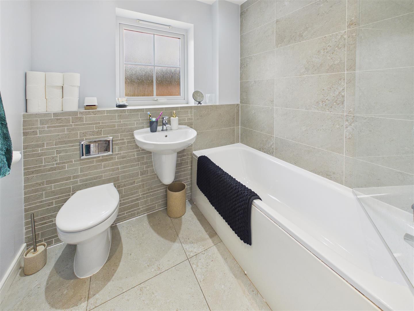 With suite comprising a bath with shower over and screen, wash hand basin and low flush W.C. Part tiling to walls, tiled floor, heated towel rail and window to the front elevation.