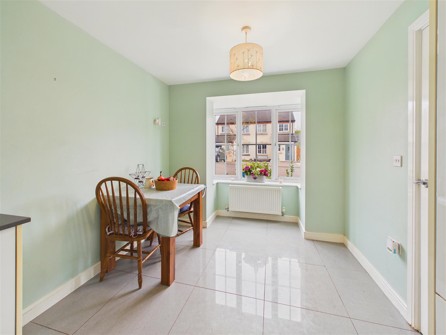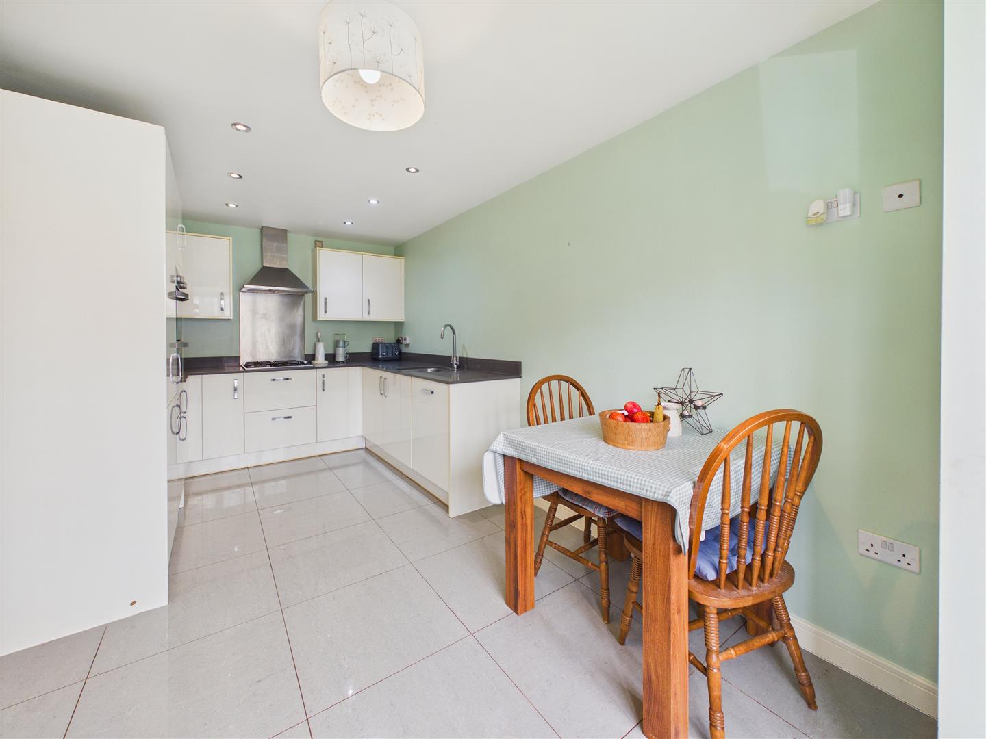 Having a range of stylish base and wall units with Quartz worktops and upstands incorporating a one and a half bowl sink with drainer. A host of integrated appliances include a double oven, four ring gas hob with extractor above, dishwasher, fridge/freezer and washing machine. There is ample space for a dining table and chairs, tiled floor and bay window to the front elevation.
