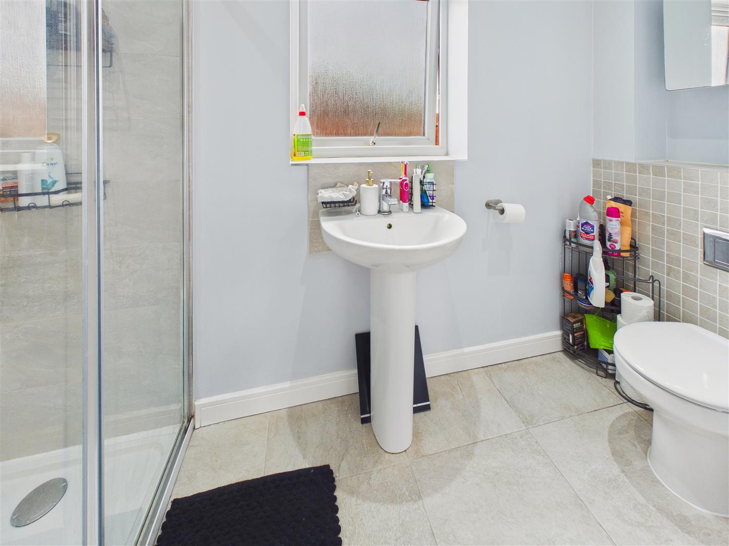With suite comprising a shower enclosure, wash hand basin and low flush W.C. Heated towel rail, tiled floor and window to rear.