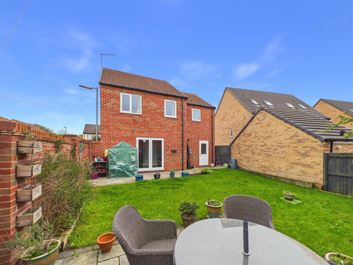 The ground floor centers around a stylish dining kitchen equipped with integrated appliances, alongside a comfortable lounge with French doors leading directly to the rear patio. A guest cloakroom and welcoming entrance hall complete the lower level.