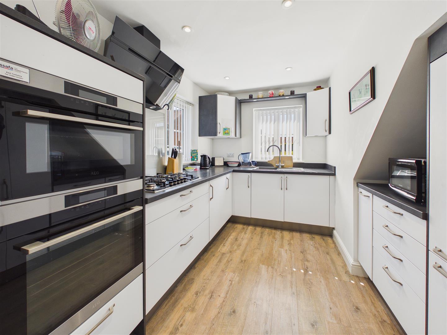 Having a stylish range of contemporary fitted units with contrasting worksurfaces, AEG twin ovens and six ring gas hob with Elica designer extractor hood above, integrated fridge, concealed washing machine, sink and drainer with mixer tap, windows to front and side elevation and external access door to side drive.